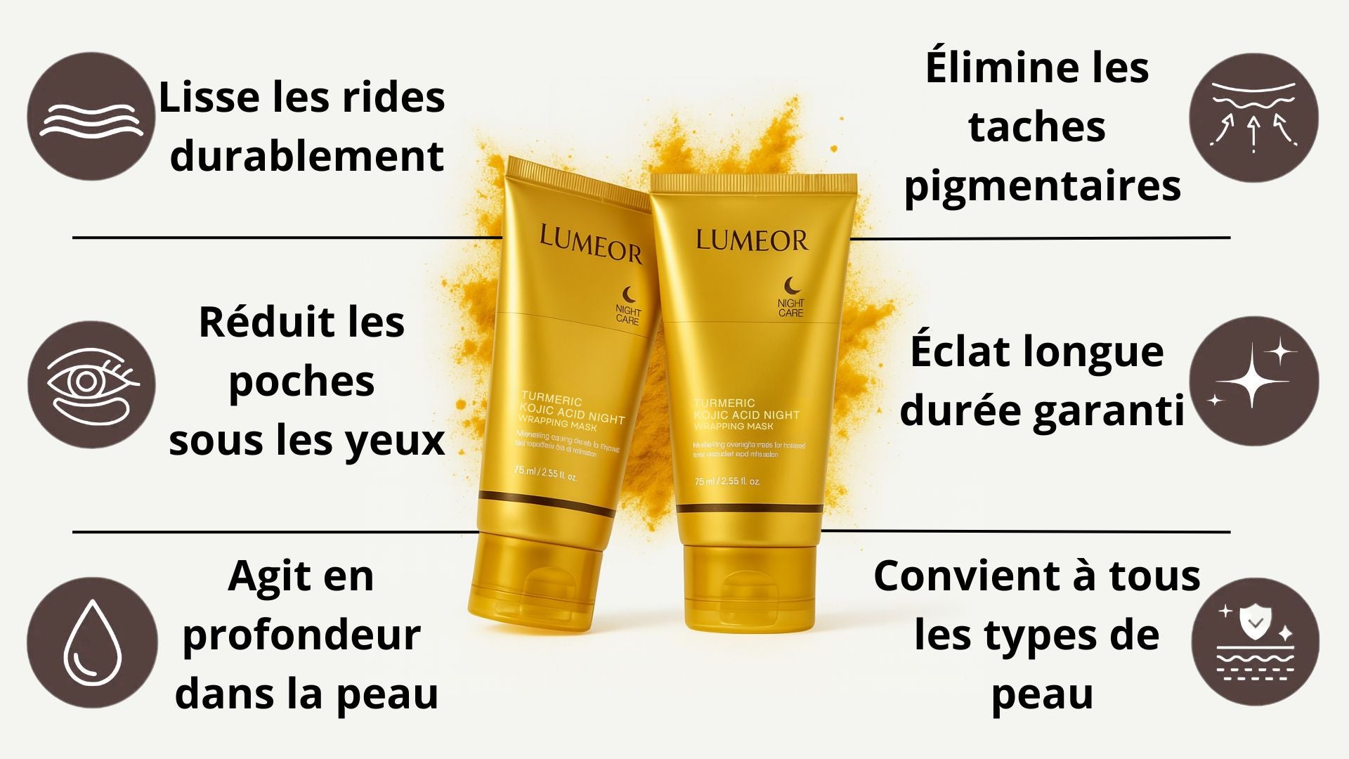 Notre masque de nuit au curcuma redonne à votre peau élasticité et éclat tout en boostant son renouvellement cellulaire. Nuit après nuit, votre teint devient plus lisse, plus frais et visiblement rajeuni. Réveillez-vous avec une peau transformée !